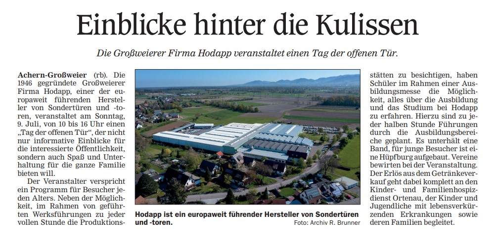 Einblicke hinter die Kulissen26. Juni 2023Die Großweierer Firma Hodapp veranstaltet einen Tag der offenen Tür. Lesen Sie dazu unsere Pressemitteilung → https://www.hodapp.de/wp-content/uploads/Bild-Kulissen.jpg 506 1007 Hodapp GmbH & Co. KG /wp-content/uploads/Hodapp-Tueren-und-Tore-1.png Hodapp GmbH & Co. KG2023-06-26 15:22:272024-08-23 15:22:43Einblicke hinter die Kulissen