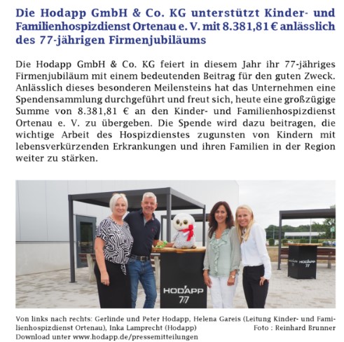 Hodapp unterstützt Kinder- und Familienhospizdienst Ortenau31. Juli 2023Die Hodapp GmbH & Co. KG unterstützt Kinder- und Familienhospizdienst Ortenau e. V. mit 8.381,81 € anlässlich des 77-jährigen Firmenjubiläums Lesen Sie dazu unsere Pressemitteilung → https://www.hodapp.de/wp-content/uploads/Bild-Kinder-unterstuetzen.jpg 488 491 Hodapp GmbH & Co. KG /wp-content/uploads/Hodapp-Tueren-und-Tore-1.png Hodapp GmbH & Co. KG2023-07-31 14:45:132024-12-13 10:42:42Hodapp unterstützt Kinder- und Familienhospizdienst Ortenau