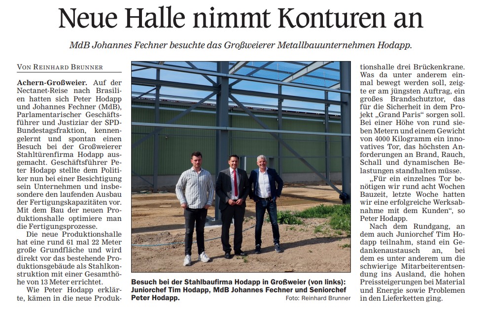 Neue Halle nimmt Konturen an15. Mai 2023MdB Johannes Fechner besuchte das Großweierer Metallbauunternehmen Hodapp. Lesen Sie dazu unsere Pressemitteilung → https://www.hodapp.de/wp-content/uploads/Bild-Halle.jpg 630 986 Hodapp GmbH & Co. KG /wp-content/uploads/Hodapp-Tueren-und-Tore-1.png Hodapp GmbH & Co. KG2023-05-15 15:28:072024-08-23 15:29:40Neue Halle nimmt Konturen an