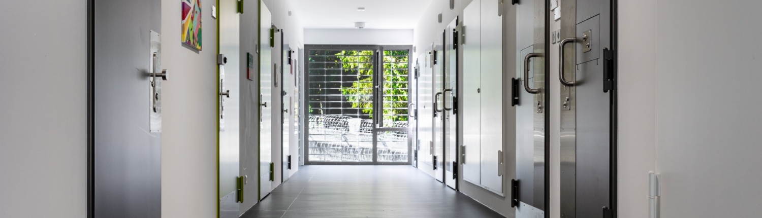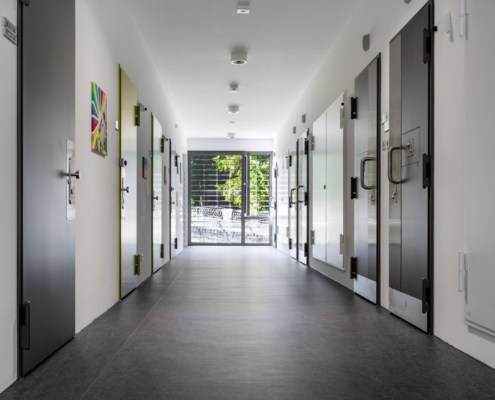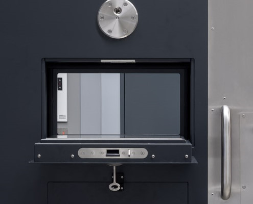 Haftraumtüren sind barrierefreie Sicherheitsstahltüren für den Einsatz in Polizeistationen, Gerichten, Justizvollzugsanstalten, forensischen Kliniken und sonstigen Arrestzellen.
