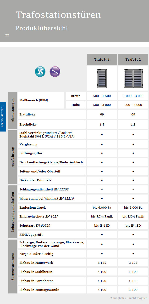 Die Trafostationstür ist ein eigens für die Anwendung in Technikgebäuden, wie z. B. Trafostationen, Rechenzentren und Umspannwerken entwickeltes Stahl-Vollblatt-Türsystem. Der Bedarf nach solch einer Tür erwuchs aufgrund der Tatsache, dass die elektrischen Bauteile im Inneren dieser Technikgebäude mit ausreichend Frischluft versorgt werden müssen.